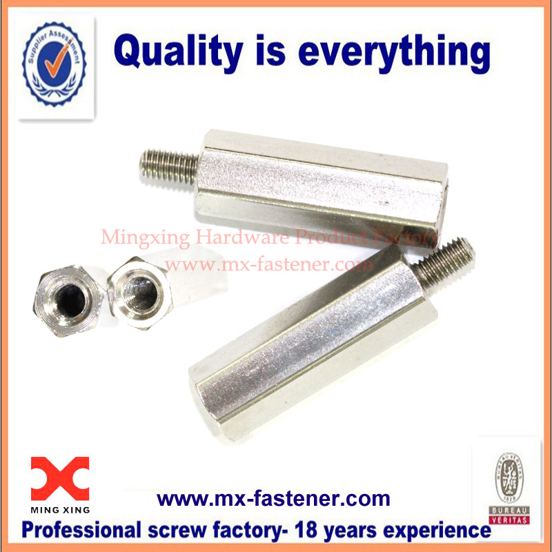 A standoff is a threaded separator of defined length used to raise one assembly above another. They are usually round or hex (for wrench tightening), often made of aluminum, brass, or nylon, and come in male-female or female-female forms. In electronics they are frequently used to raise a printed-circuit board above a surface. Insulating standoffs keep two parts from touching each other, thereby preventing electrical shorts. When used to fasten cable connectors (i.e. “D” connectors) together, they are called “jack screws”.