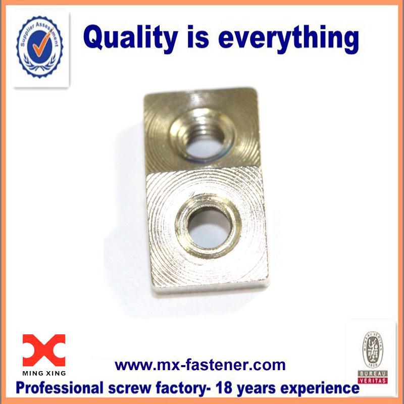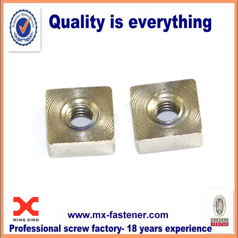 A square nut is a four-sided nut. Compared to standard hex nuts, square nuts have a greater surface in contact with the part being fastened, and therefore provide greater resistance to loosening (though also greater resistance to tightening). They are also much less likely to become rounded-off after repeated loosening/tightening cycles. Square nuts are typically mated with square-headed bolts. Square nuts are used along with flat washers in order to avoid damage from its sharp edges and helps to increase the strength of the fastener.